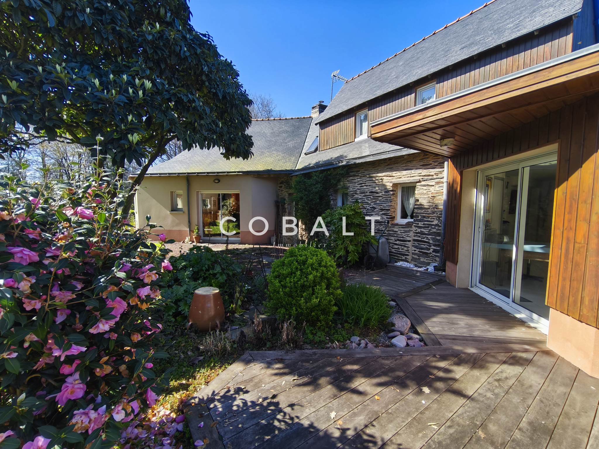 Cobalt Immobilier Blain vous présente cette très belle maison d'architecte de 190 m² située dans un hameau à 7 mins de Guémené-Penfao et moins de 15 mins de l'axe Nantes/Rennes. Idéalement située dans son jardin paysagé de 3348 m², le charme des matériaux comme le bois et la pierre vous inspirera de suite à la détente.